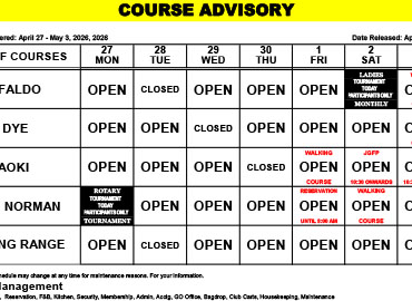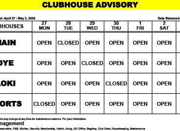 Clubhouse Advisory – April 27-May 3, 2026