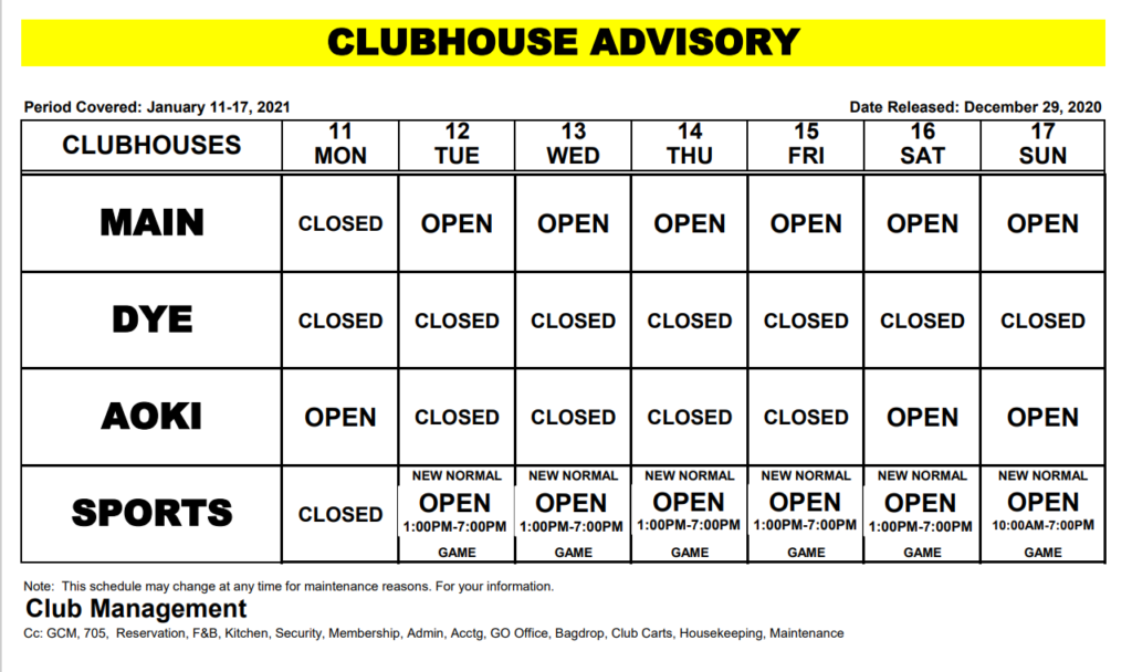 Clubhouse Advisory – January 11-17, 2021