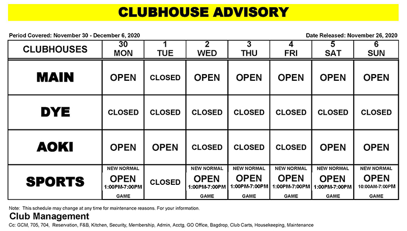 Clubhouse Advisory – November 30 – December 6, 2020