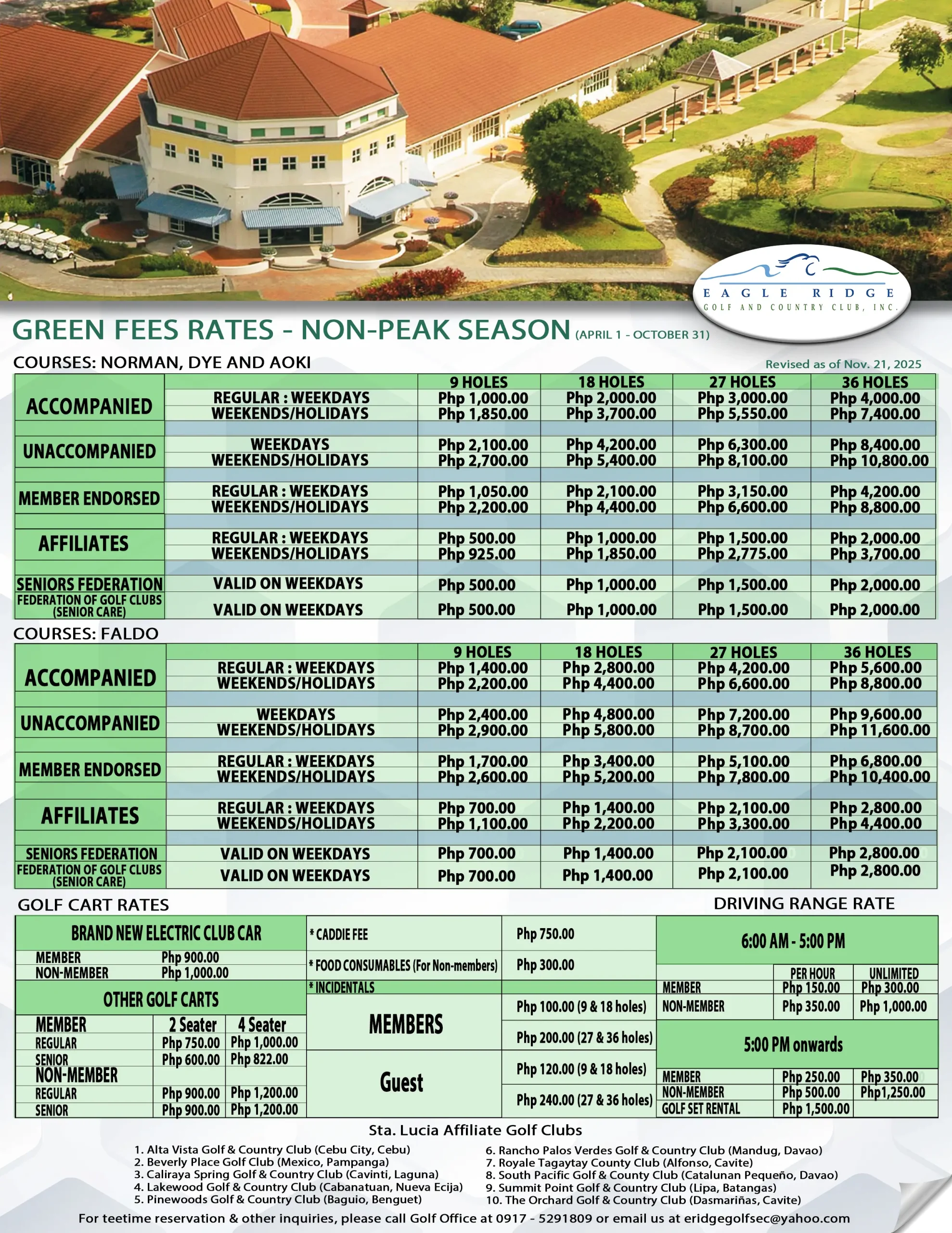 Golf Tariff Rates Download PDF Golf Rates Effective January 1, 2023 Download PDF Download PDF GREEN FEES Member Accompanied Rate 9 Holes 18 Holes 27 Holes 36 Holes Weekdays 672.00 Php 1344.00 Php 2016.00 Php 2688.00 Php Weekends/Holidays 1400.00 Php 2800.00 Php 4200.00 Php 5600.00 Php Affiliate Rate 9 Holes 18 Holes 27 Holes 36 Holes Weekdays 336.00 Php 672.00 Php 1008.00 Php 1344.00 Php Weekends/Holidays 700.00 Php 1400.00 Php 2100.00 Php 2800.00 Php Federation of Golf Clubs (Senior Care) Rate 9 Holes 18 Holes 27 Holes 36 Holes 50% of Accompanied rates Valid on Weekdays. Must be accompanied by a member. Seniors Federation Rate 9 Holes 18 Holes 27 Holes 36 Holes 50% of Accompanied rates. Valid on Mondays, Wednesdays, and Fridays. Must be accompanied by a member. Visitor's Rate 9 Holes 18 Holes 27 Holes 36 Holes Weekdays 1680.00 Php 3360.00 Php 5040.00 Php 6720.00 Php Weekends/Holidays 2240.00 Php 4480.00 Php 6720.00 Php 8960.00 Php Golf Cart Rate Type 9 Holes 18 Holes 27 Holes 36 Holes Member Regular 2-Seater 375.00 Php 750.00 Php 1125.00 Php 1500.00 Php Senior / Solo 375.00 Php 600.00 Php 900.00 Php 1200.00 Php Regular 4-Seater 500.00 Php 1000.00 Php 1500.00 Php 2000.00 Php Senior / Solo 411.00 Php 822.00 Php 1233.00 Php 1644.00 Php Non-Member 2-Seater 450.00 Php 900.00 Php 1350.00 Php 1800.00 Php 4-Seater 600.00 Php 1200.00 Php 1800.00 Php 2400.00 Php Incidental Fees 9 Holes 18 Holes 27 Holes 36 Holes Member 80.00 Php 80.00 Php 160.00 Php 160.00 Php Guest 100.00 Php 100.00 Php 200.00 Php 200.00 Php **Mandatory 300 food consumable. * Prices are subject to change without prior notice.