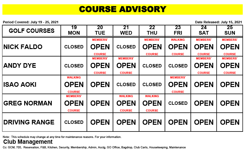 Course Advisory – July 19 – 25, 2021