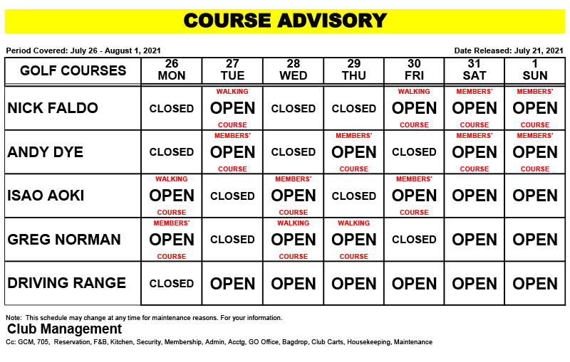 Course Advisory – July 26 – August 1, 2021