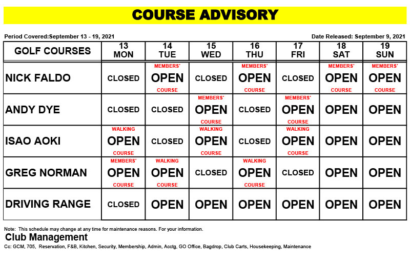 Course Advisory – September 13 – 19, 2021